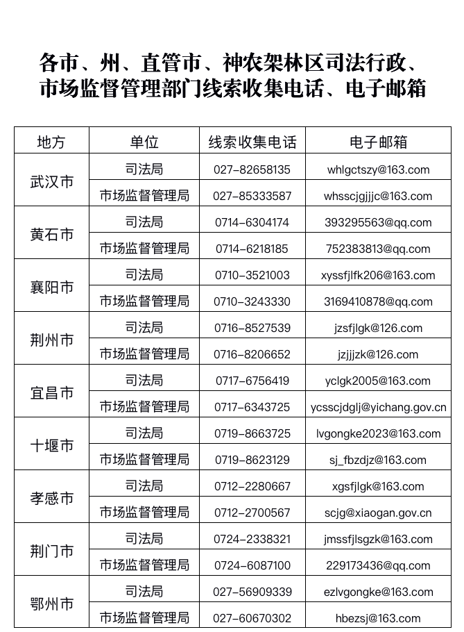 湖北省司法厅、湖北省市场监督管理局关于规范全省省级顾问法律服务专项行动投诉举报渠道的公告